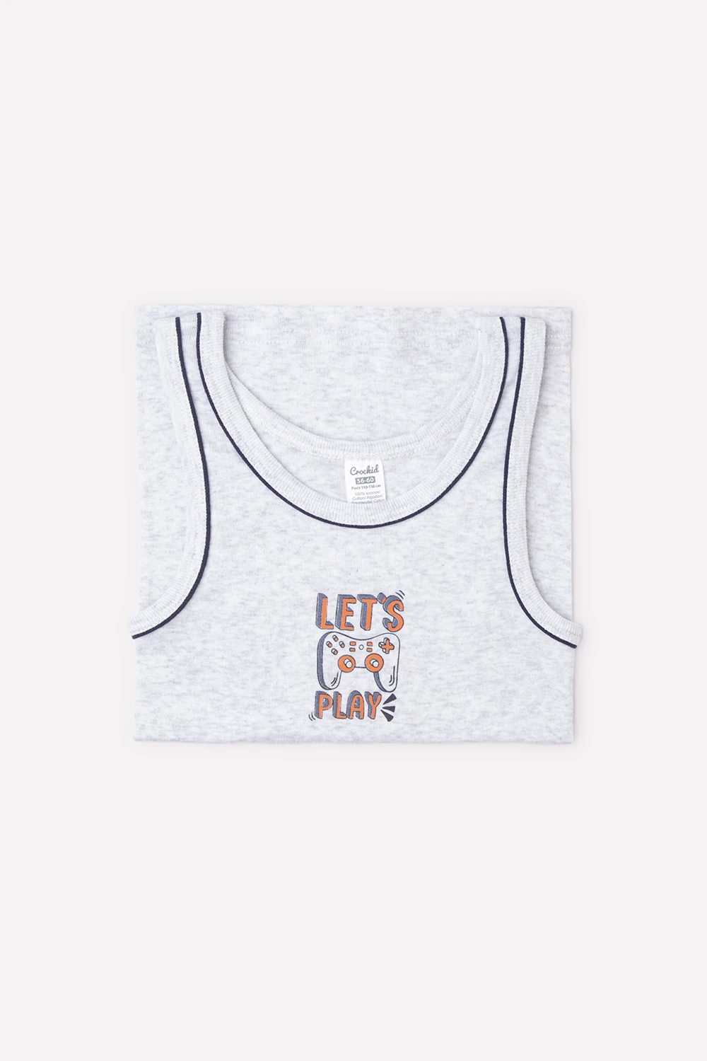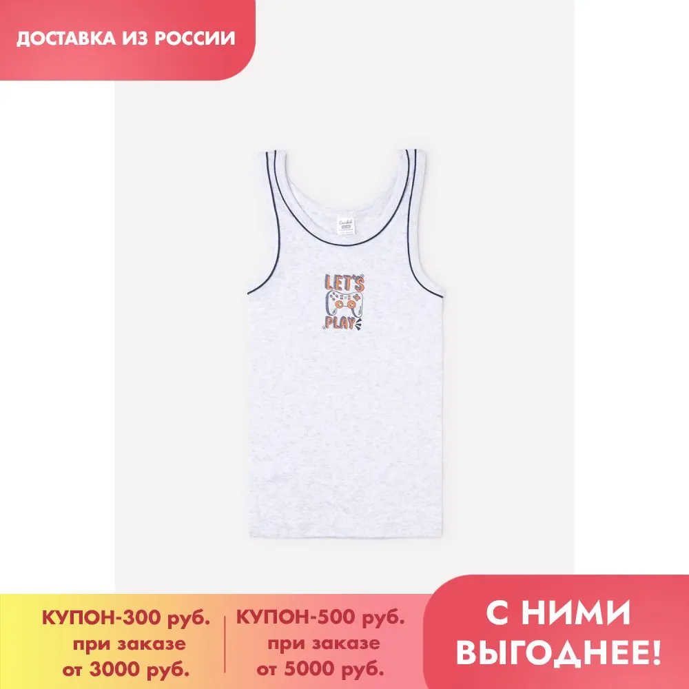 Описание: Хлопковая майка для мальчика светло-серого цвета с принтом. Горловина и проймы обработаны бейкой и синим кантом.