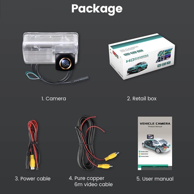 1. Камера заднего вида2. Розничная коробка3. Кабель питания4. Чистый медный 6 м видео кабель5. Руководство пользователя