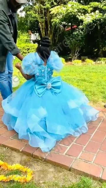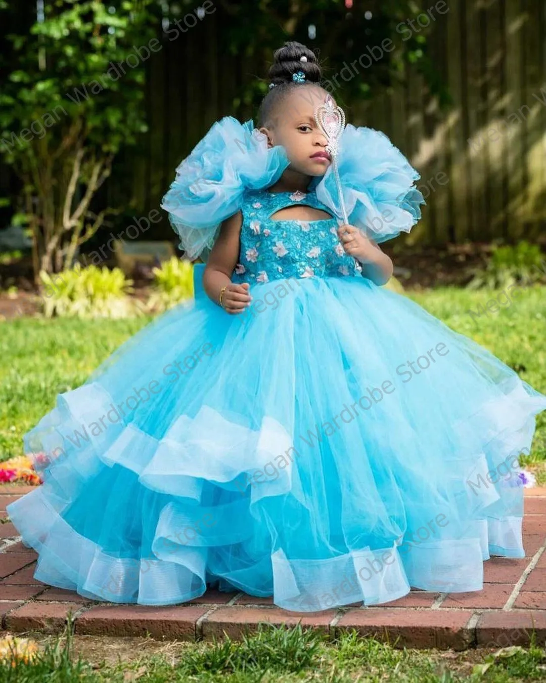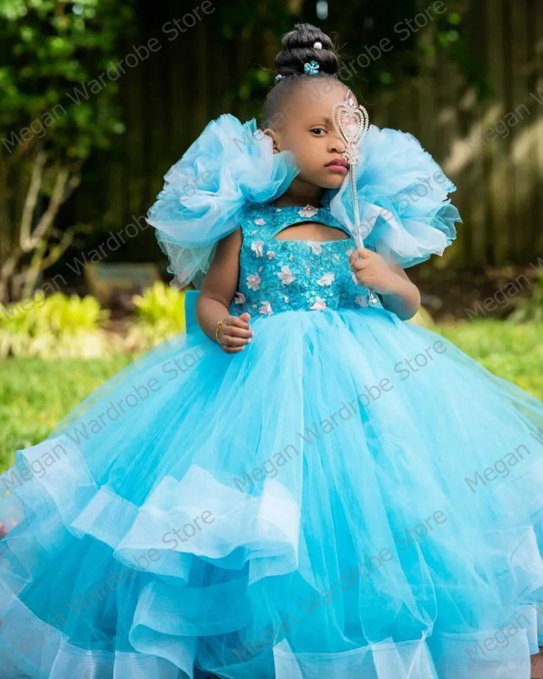 Блестящие Длинные платья небесно-голубого цвета с оборками, Длинные тюлевые Цветочные Свадебные платья для девочек, трапециевидная 3D аппликация, детская одежда с рукавами
