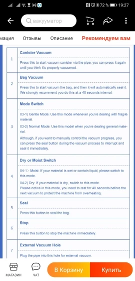 Доставка до ХМАО за неделю. Очень быстро. Курьер принёс домой посылку. Все как на фото и видео. Быстро и удобно упаковывать. Очень понравилось. Рекомендую. Надеюсь прослужит долго. Инструкция на китайском языке. Прикладываю перевод.
