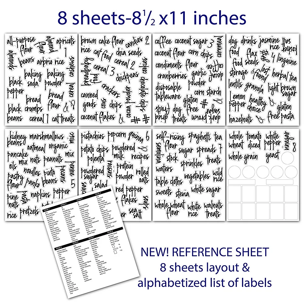 150 этикеток для хранения продуктов, от универсальной муки, кофе или оливкового масла до зерен или макаронных изделий, вы можете найти их! Есть также 18 пустых наклеек для использования, этот набор содержит подробные справочные таблицы и список ордеров в алфавитном порядке.