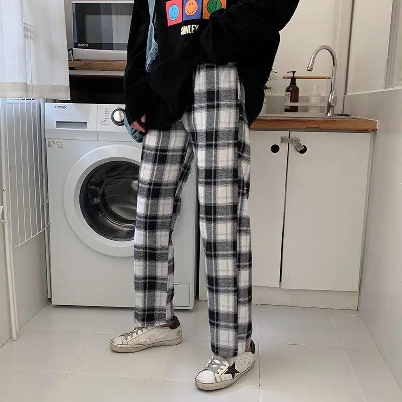 Женские клетчатые брюки в стиле Харадзюку, широкие брюки большого размера, женская пижама в клетку с высокой талией в Корейском стиле, весна-лето 2022