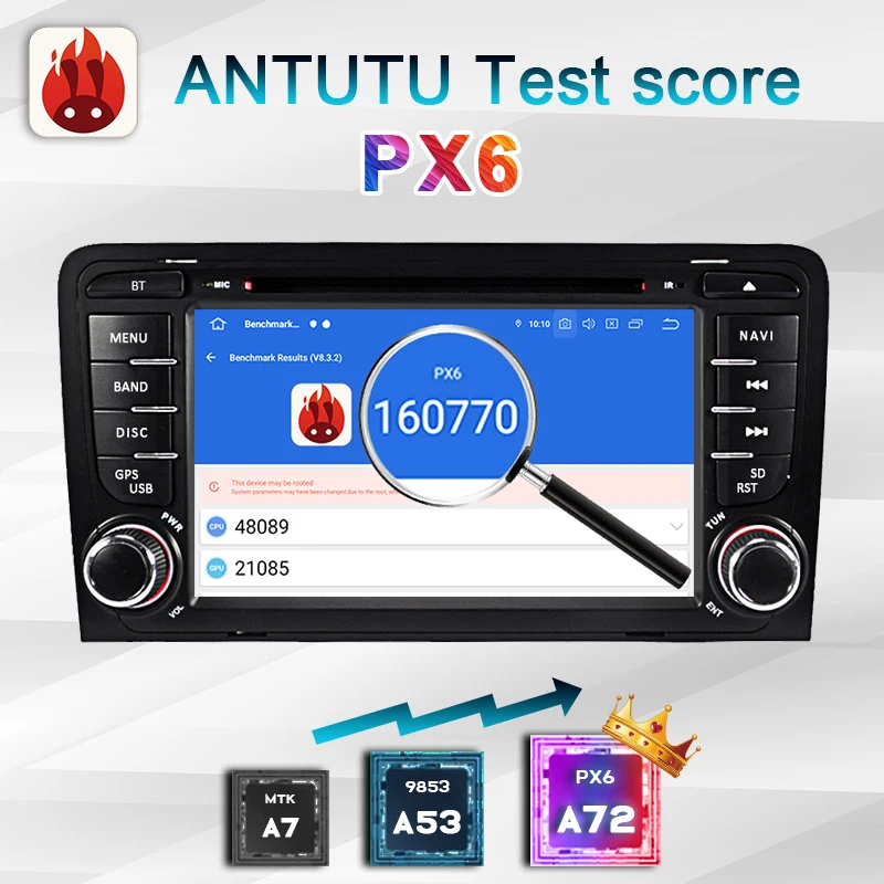 PX6PX6 является лучшим чипом на рынке в настоящее время, он работает быстрее, чем все другие типы. Балл ANTUTU составляет 160770, что лучше 9853 4G + 64G, PX5 и всех других типов 4 + 64G на рынке. По сравнению с другими радио типа fo, PX6 radio может загружать больше видов приложений android с android market, и приложение может работать лучше.