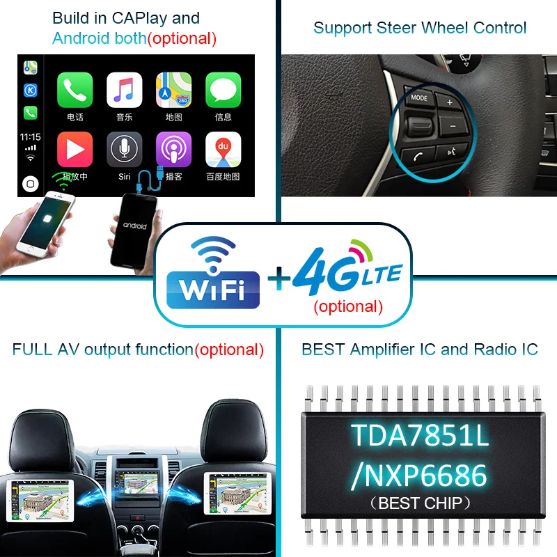 ЧипыРадио использует лучшие радио chip-NXP6686 и лучший усилитель chip-TDA7851L.Чип NXP6686 является лучшим радиочипом, и лучше than7708,6851 и любой другой радиочип. Это лучший радиочип на рынке в настоящее время. Хороший радиочип делает радиосигнал более сильным.TDA7851L является лучшим амплитудным IC на рынке в настоящее время. Лучше, чем 7388, и все остальные. Это делает качество звука автомобиля лучше, чем у других типов радио. Если вам нужно лучшее качество звука, мы предлагаем вам также выбрать функцию DSP, DSP-это система цифрового усилителя, которая предлагает лучшее качество звука.