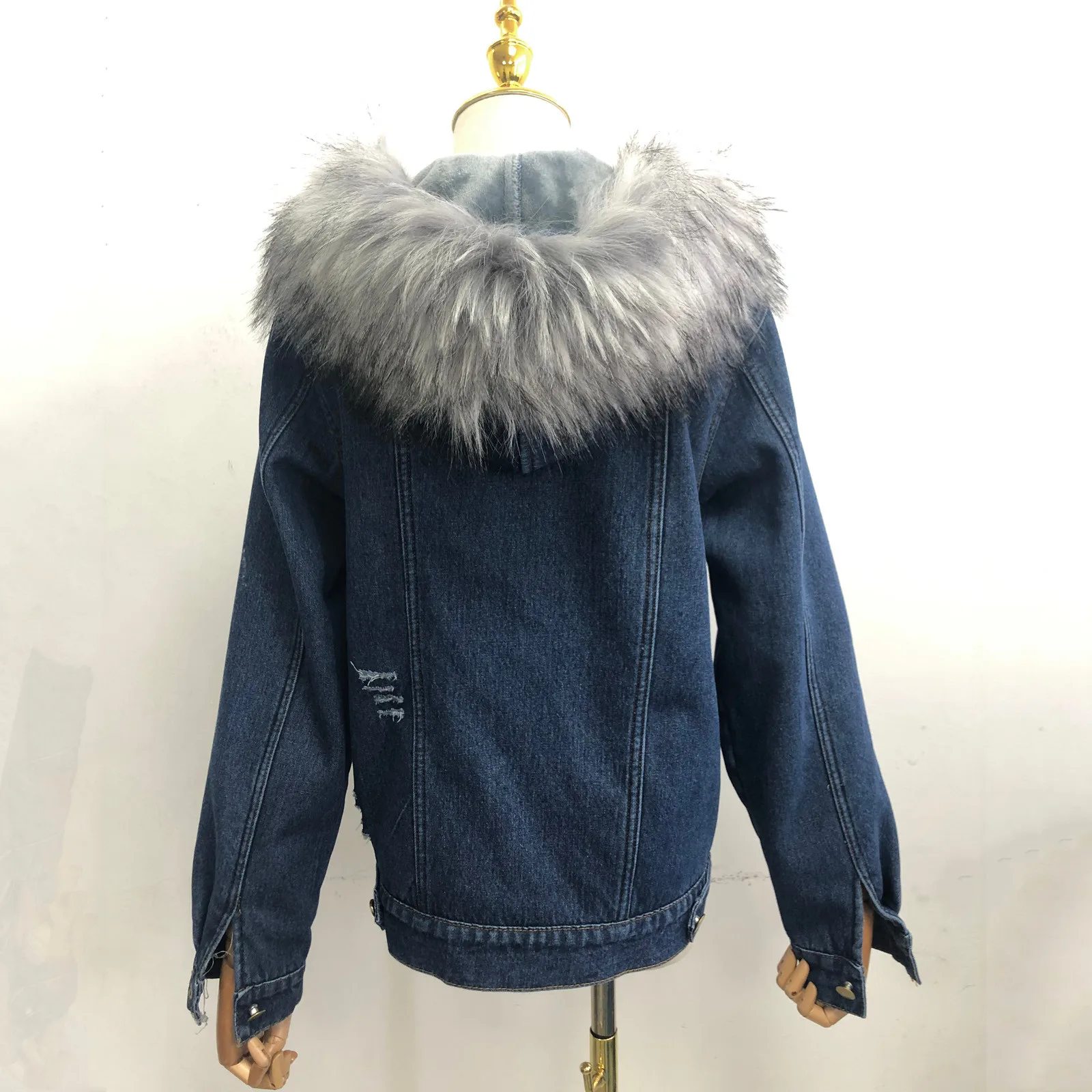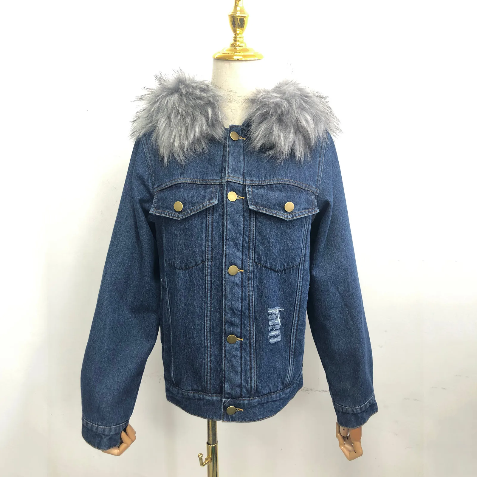 Женское джинсовое однотонное пальто с длинными рукавами и меховым воротником
