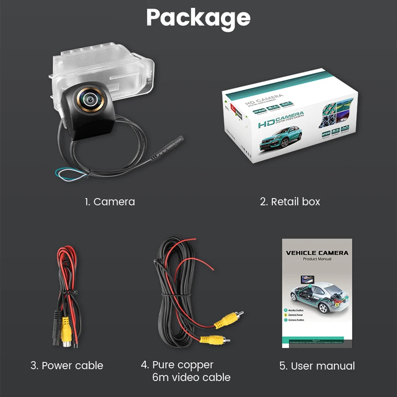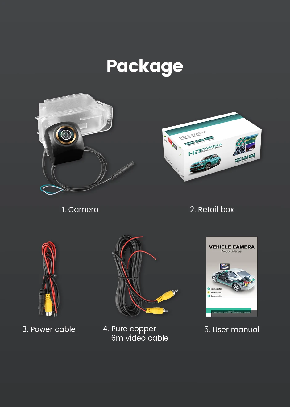 1. Камера заднего вида2. Розничная коробка3. Кабель питания4. Чистый медный 6 м видео кабель5. Руководство пользователя