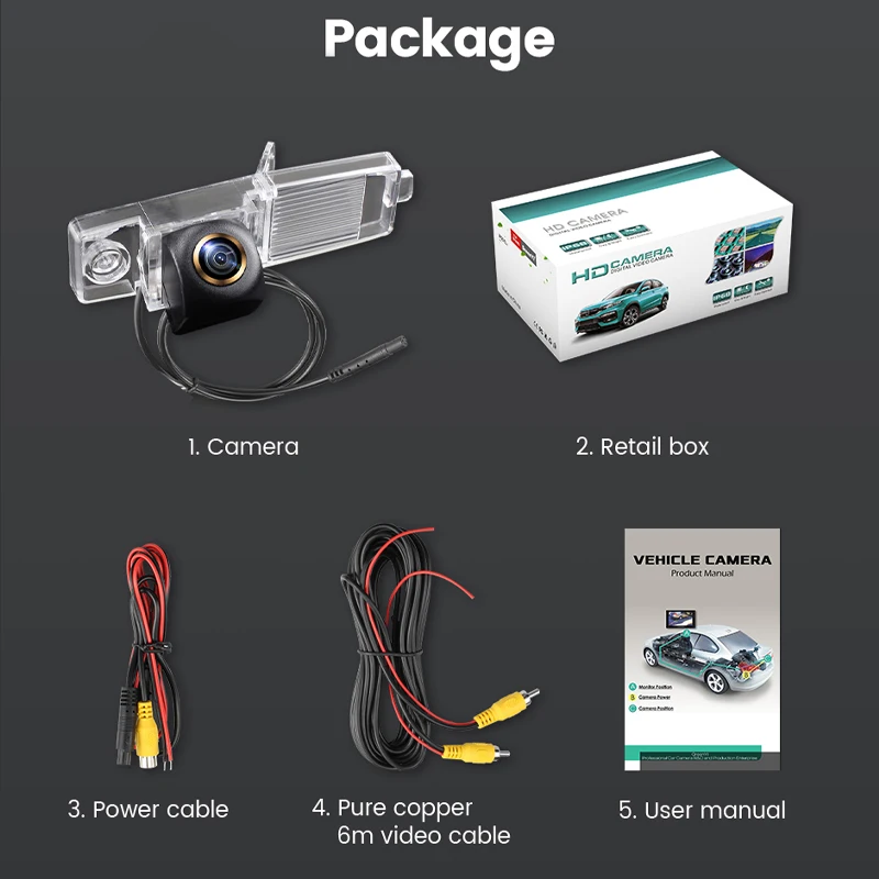 1. Камера заднего вида2. Розничная коробка3. Кабель питания4. Чистый медный 6 м видео кабель5. Руководство пользователя