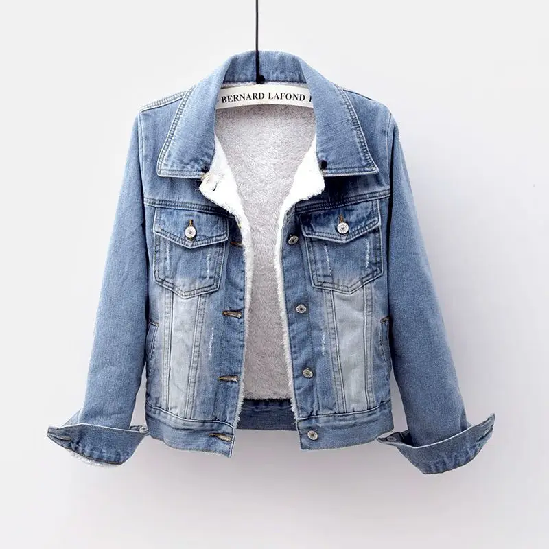 Куртка женская короткая джинсовая, на пуговицах, с начесом, однотон...