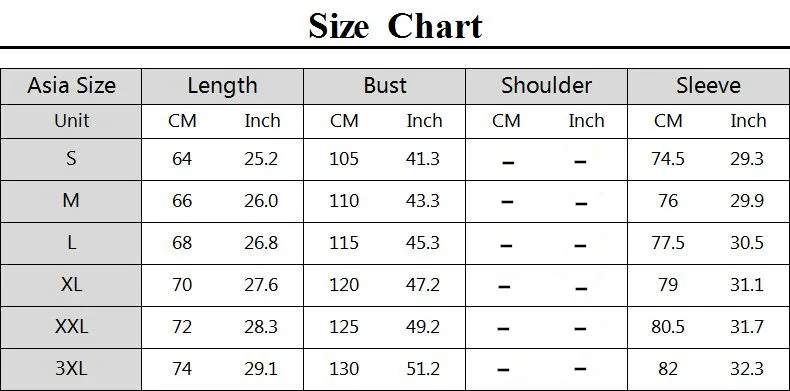 Примечания:Мы используем Азиатские размеры, примерно на 2-3 размера меньше, чем американские/Европейские.Если вы не уверены в размере, пожалуйста, отправьте информацию о вашем росте, весе и плечах,Бюст мне, я помогу вам выбрать правильный размер.Размер: допускается погрешность в 1-3 см из-за ручного измерения. 1 дюйм = 2,54 дюйма, 1 см = 0,39 дюймов.О цветах: цвета могут немного отличаться по таким причинам, как освещение.