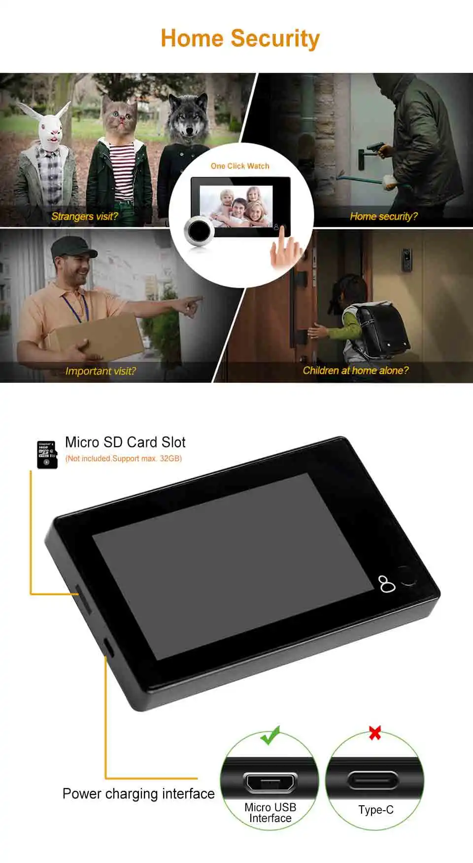 Все работает, пришло быстро. Установка заняла несколько минут. Пришлось повозиться с настройкой горизонта. Во внутреннюю память сохраняет 3 фото, можно вставить флешку для расширения. Аккумулятор от старой Нокиа. Зарядки нет, только длинный кабель. Угол обзора около 100 град., мало конечно, но больше не найдёте. При слабой освещённости картинка размытая, это ожидаемо. В общем покупка не удивила, к недостаткам был готов. Теперь дети могут видеть, кто пришёл и сохранять фото.