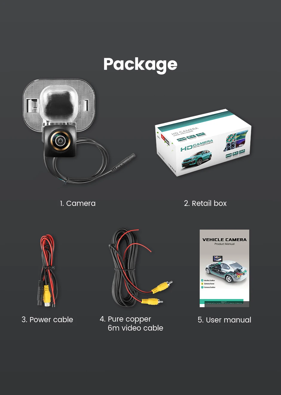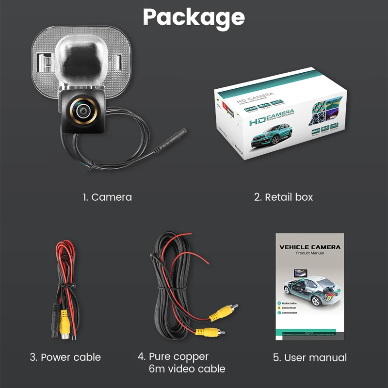 1. Камера заднего вида2. Розничная коробка3. Кабель питания4. Видеокабель из чистой меди 6 м5. Руководство пользователя