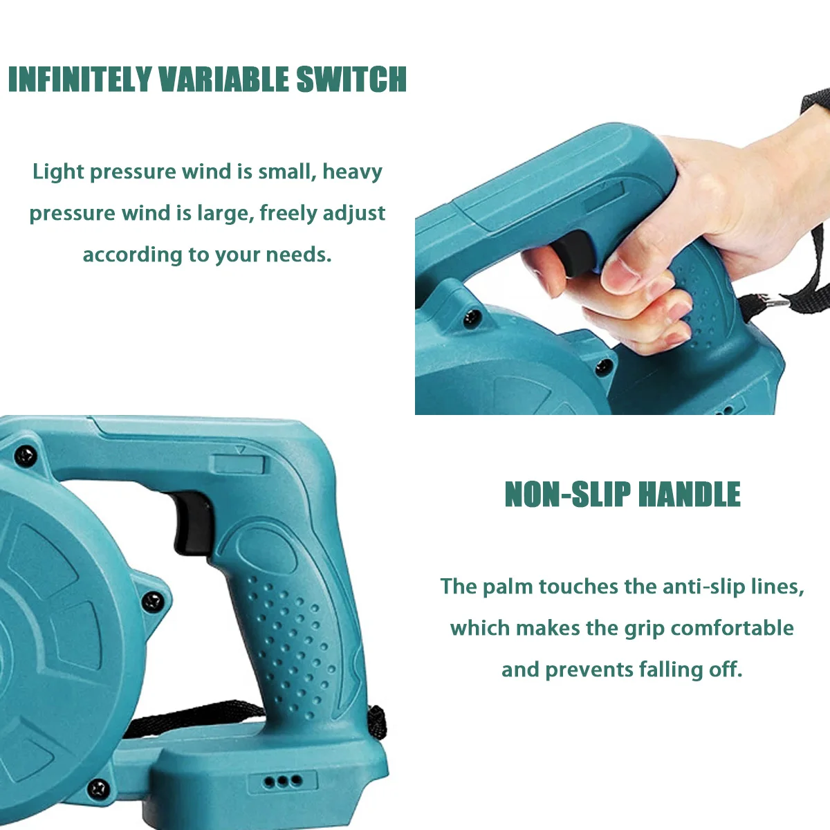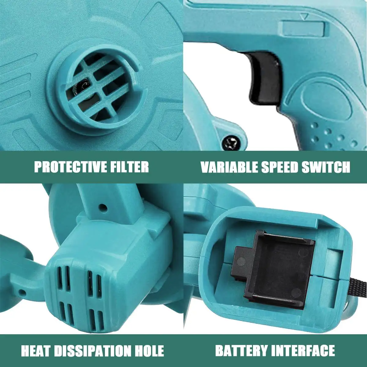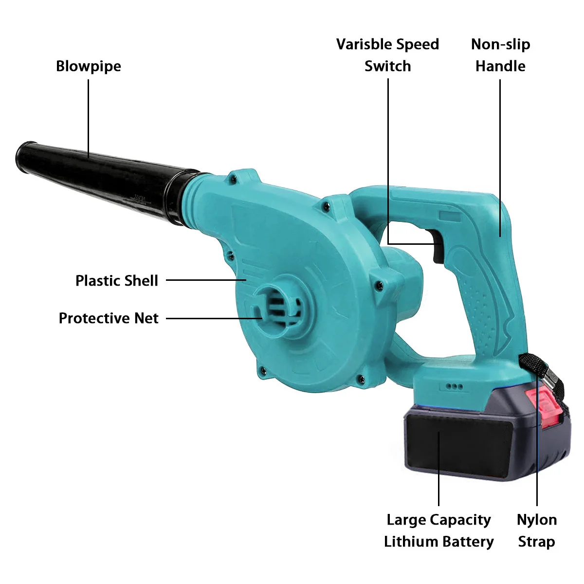 Особенности:1. Функция выдувания и всасывания 2 в 1.2. Сильный умный мотор без щеток может достичь пониженной скорости.3. Ветровое лезвие изготовлено из хорошего пластика, который имеет лучшую прочность и, таким образом, обеспечивает более сильную ветряную энергию.4. Портативный дизайн, вы можете легко использовать его одной рукой.5. Компактный, легкий и простой в использовании, вентилятор быстро очищает листья и мусор.6. Беспроводной дизайн, эргономичный дизайн и приятная ручка, наш воздуходувка дает вам полную и удобную мобильность.7. Шланг Вентилятора съемный для удобного хранения.