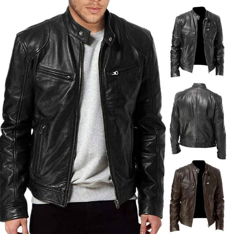 Мужские модные кожаные куртки со стоячим воротником, мужские повсед...