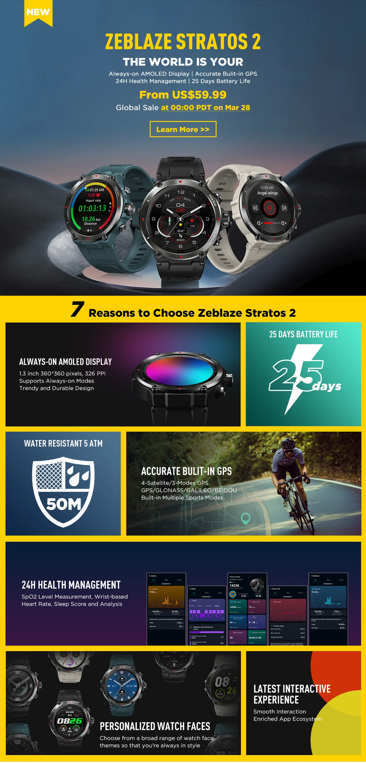 Zeblaze Stratos поставляется со встроенным GPS, компасом в тренировочном режиме, пульсом на запястье, GPS, тестами производительности и отслеживанием восстановления. Он предлагает вам руководство и данные, чтобы помочь вам получить более сильные и основные функции умных часов, чтобы вы были подключены. Чехол изготовлен из армированного углеродным волокном полимера, поэтому он достаточно прочный и долговечный, чтобы выдерживать любые внешние условия окружающей среды. С Stratos, если вы тренируетесь на улице в течение 3 часов каждый день, он может обеспечить вам 25 дней выносливости в режиме смарт-часов. Stratos для вас, где бы и что бы вы ни делали.