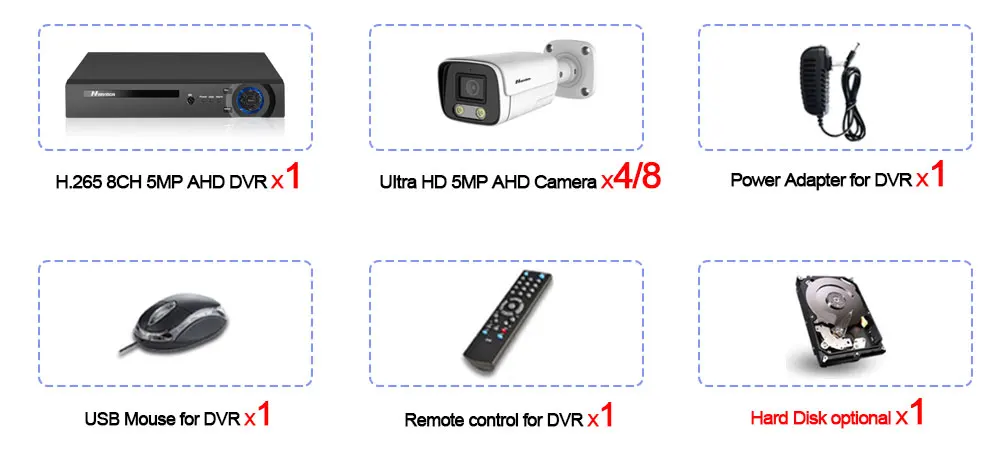 1 х 8-канальный H.265 AHD 4K DVR NVR HVR 6 в 1 цифровой видеорегистратор;4/8 X HD 5.0MP Крытый Открытый ИК Полный Цвет ночного видения атмосферостойкие камеры;1 х адаптер питания для DVR;1 X USB мышь для DVR;1 компакт-диск программного обеспечения для DVR;1 пульт дистанционного управления для DVR;Жесткий диск опционально!Видео кабель в комплект не входит!