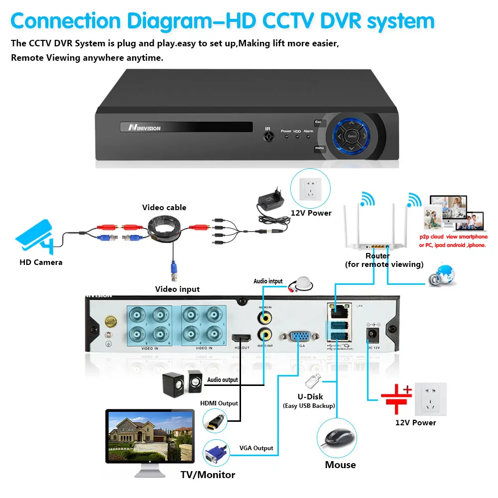 Простая настройка, всего 4 шага для просмотра мобильный телефон, просмотра видео в режиме реального времени из любого места и в любое время с помощью смартфона, стола или ПК с передовой технологией P2P, вы можете получить удаленный доступ к вашей системе за считанные минуты или меньше, нет необходимости в переадресации, удаленный доступ никогда не был таким простым!
