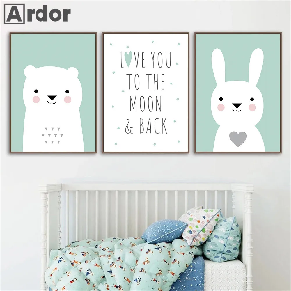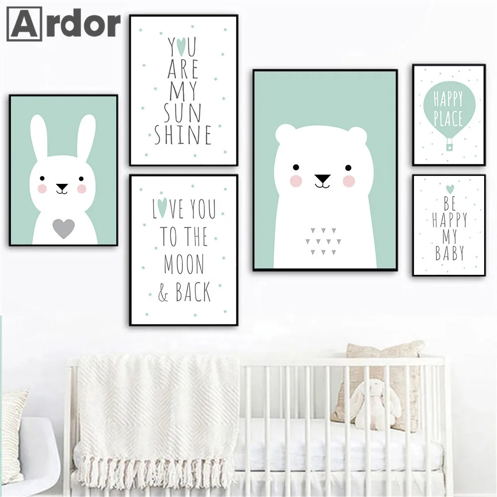 Плакат с зеленым воздушным шаром, детский медведь, кролик, холст, картина для детской, настенная печать, цитаты, плакат, настенные картины, декор для детской комнаты
