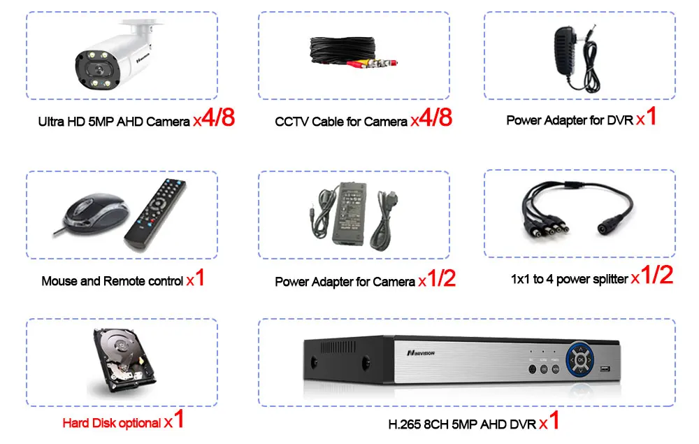 1 X 8CH H.265 4K 6 в 1 DVR цифровой видеорегистраторКамеры дневного ночного видения 4/8 x HD 5.0MP для помещений и улицы;4/8x65 футов (20 м) cctv видео кабель для камеры1/2 x адаптер питания для камерКабель-разветвитель питания 1/2X1-41 х адаптер питания для DVR;1 USB-мышь для DVR;1 компакт-диск с программным обеспечением для DVR;1 х пульт дистанционного управления для DVR;Жесткий диск по желанию!