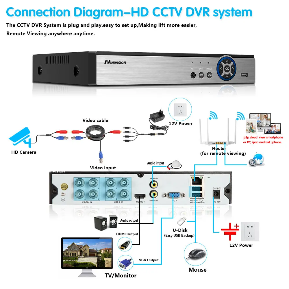Простая настройка, всего 4 шага для Мобильный телефон просмотра, просмотр видео в реальном времени системы из любого места и в любое время с помощью смартфона, стола или ПК с передовой технологией P2P, вы можете удаленно получить доступ к вашей системе за считанные минуты или меньше, переадресация не требуется, удаленный доступ никогда не был таким простым!
