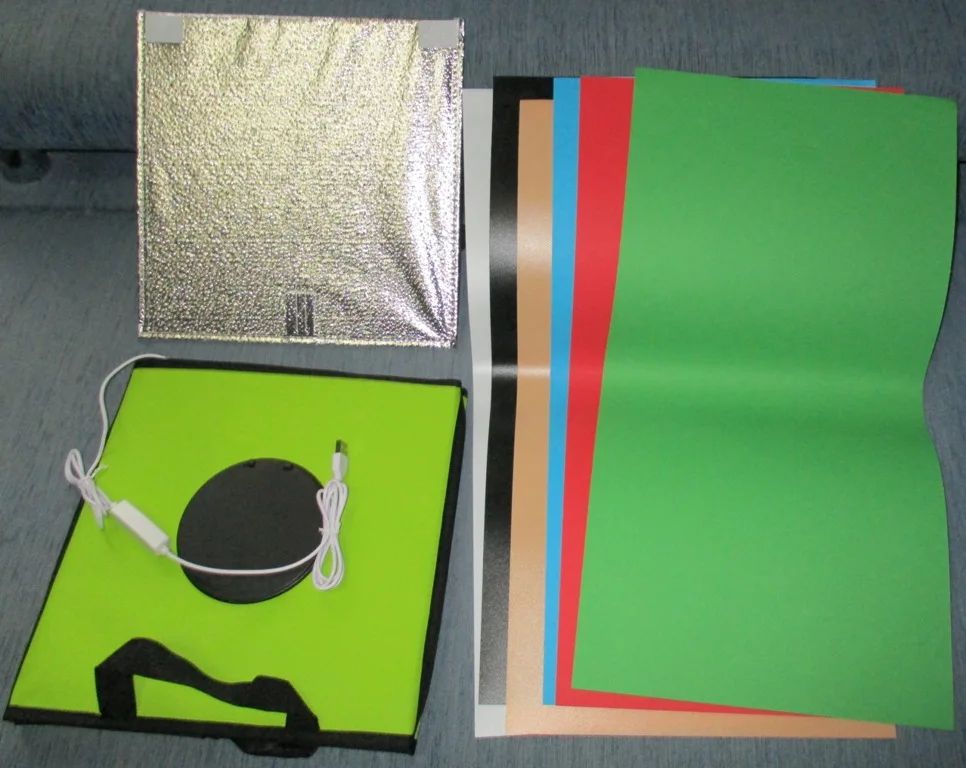 Посылка в коробке 25 см1. Фотостудия (кольцевой светильник) x 12. Мягкий чехол x 13. Черная/белая фоновая бумага x 14. Серая/Золотая фоновая бумага x 15. Желтая/оранжевая фоновая бумага x 16. Красный/розовый фон x 17. Синяя/фиолетовая фоновая бумага x 18. Зеленая/коричневая фоновая бумага x 19. Цветная упаковочная коробка x 1