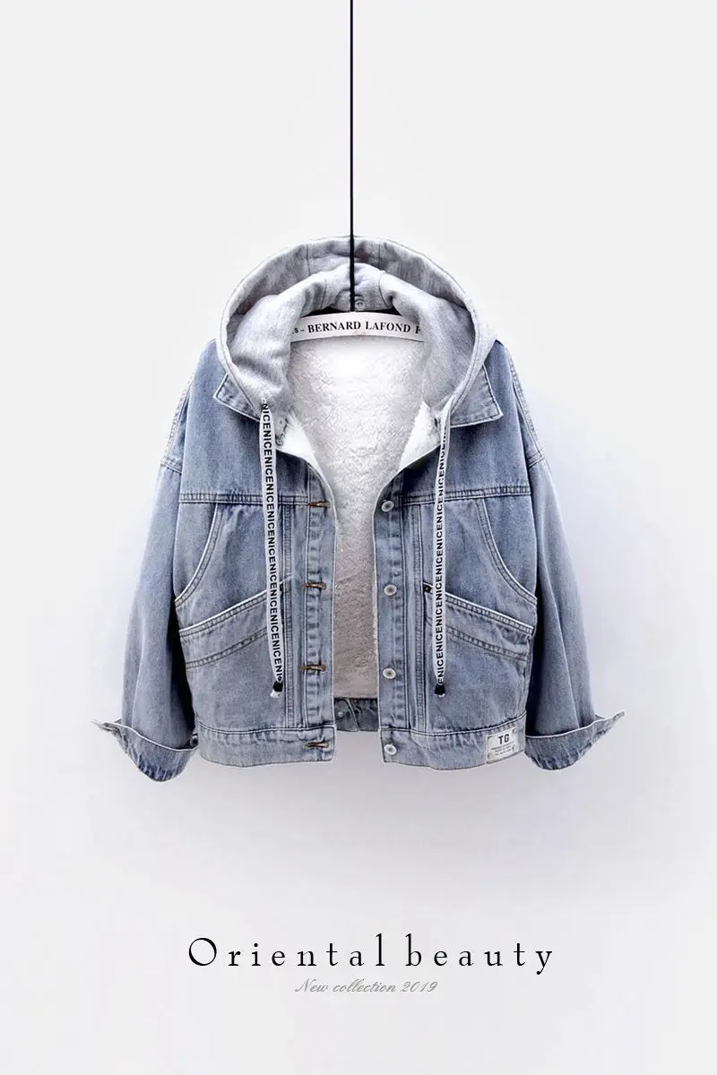 Однобортная джинсовая куртка с капюшоном для женщин, модная утеплен...