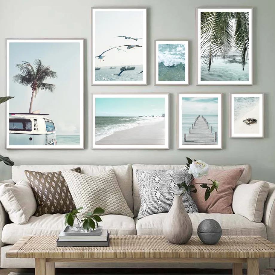 Плакат на холсте с изображением пальмовых листьев черепахи, волн, автомобиля, фургона