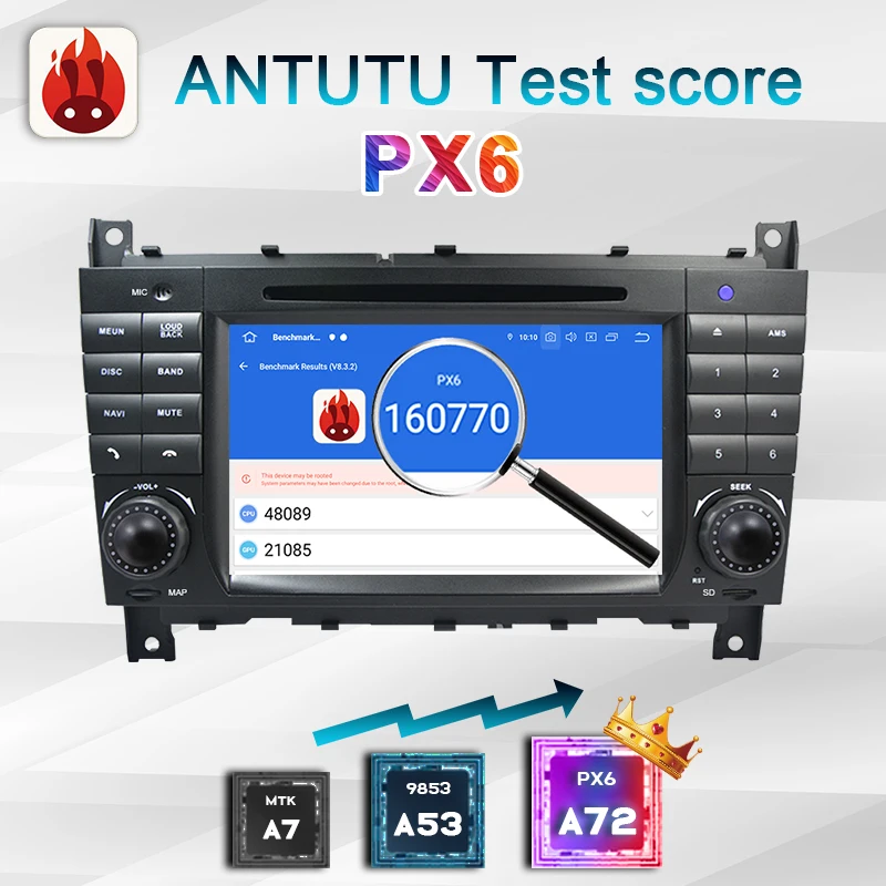 PX6PX6 является лучшим чипом на рынке в настоящее время, он работает быстрее, чем все другие типы. Балл ANTUTU составляет 160770, что лучше 7853 4G + 64G, PX5 и всех других типов 4 + 64G на рынке. По сравнению с другими радио типа fo, PX6 radio может загружать больше видов приложений android с android market, и приложение может работать лучше.