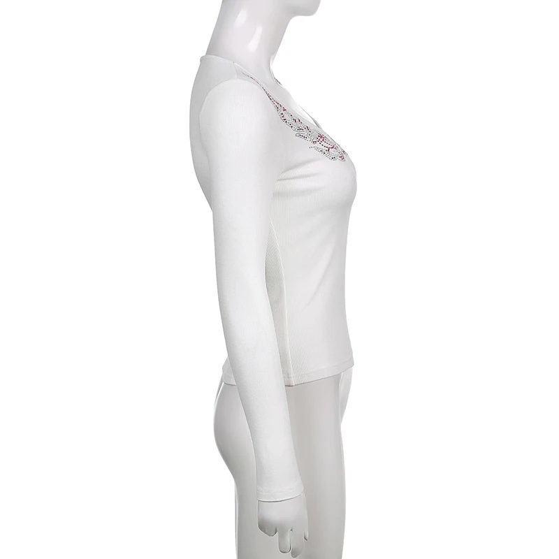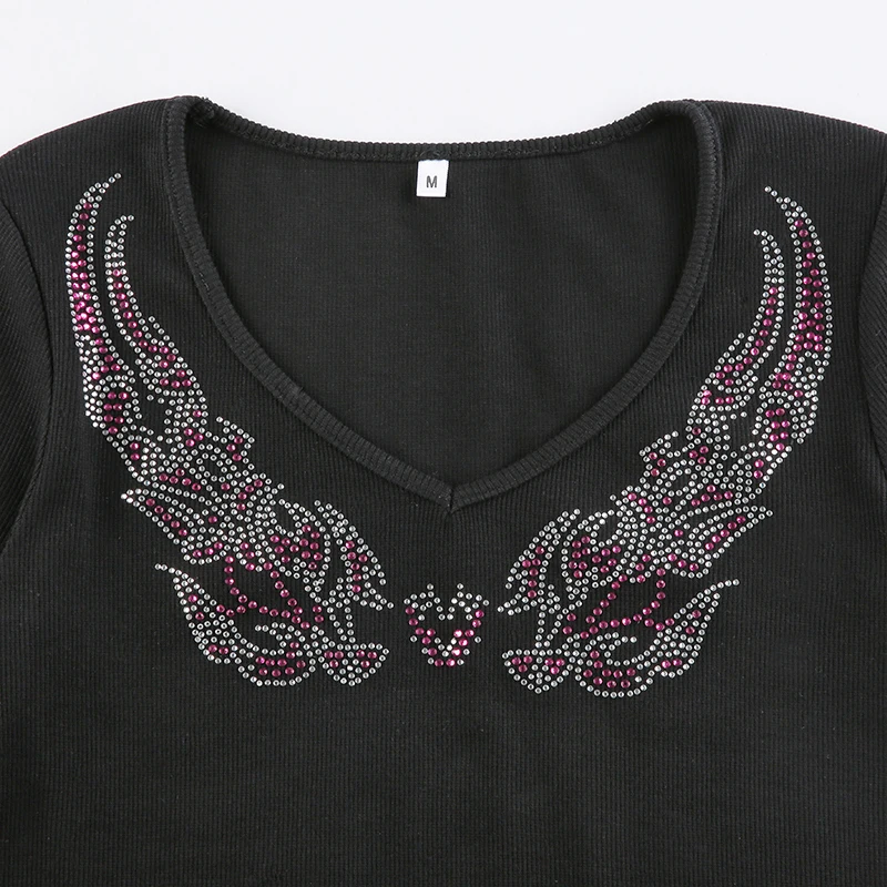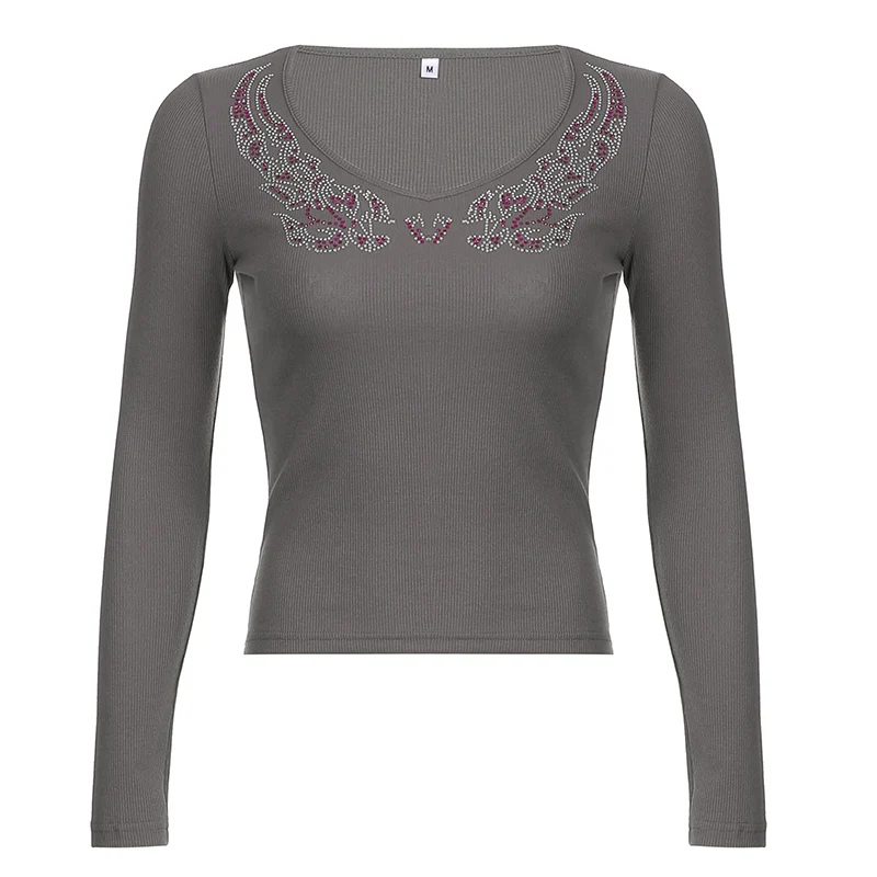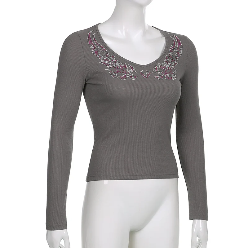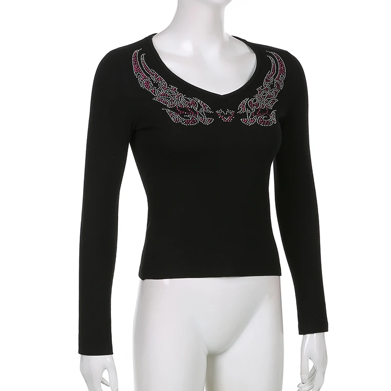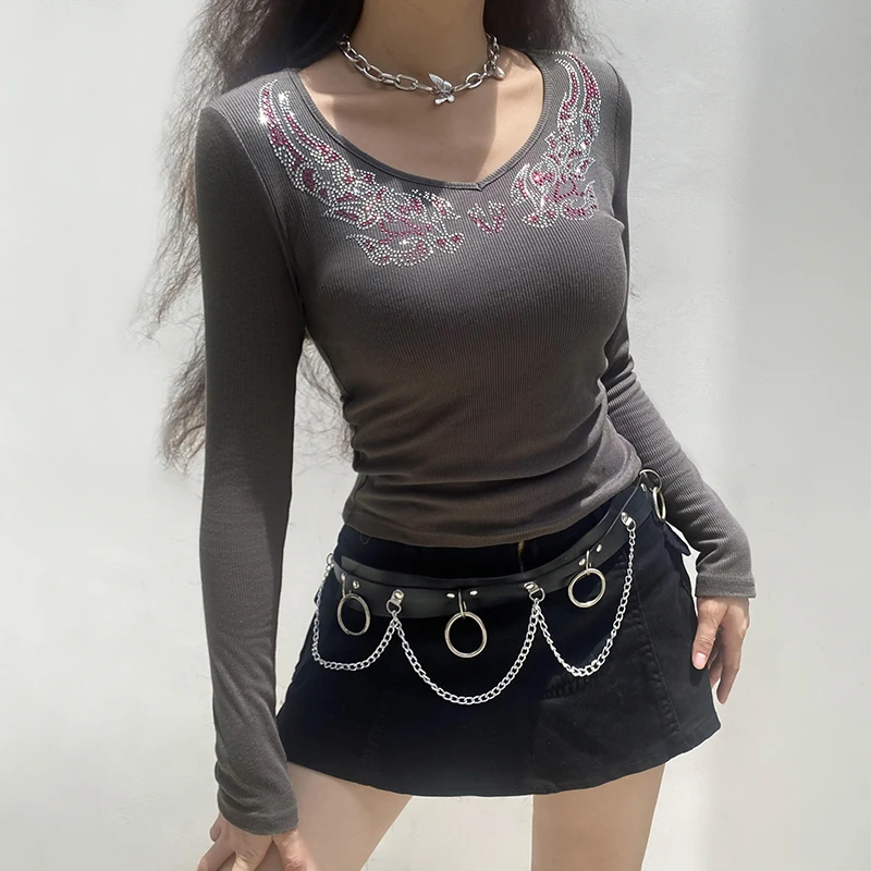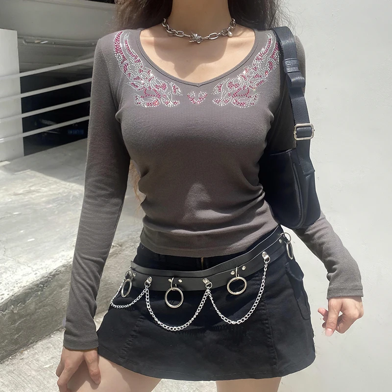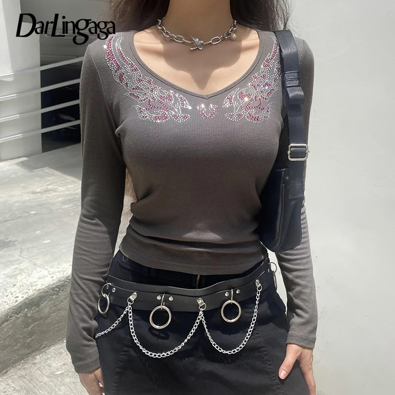 Darlingaga, винтажный Модный эстетический Топ, Осенние футболки для женщин, темная академия, готическая одежда стразы, облегающие пуловеры