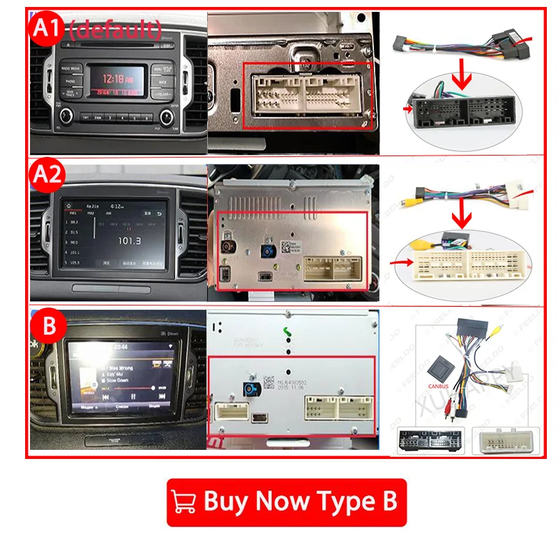 Для Kia Sport 4 есть три конфигурации автомобилей. Различные консоли и порты соответствуют различным кабелям.1. Если вашему автомобилю нужен кабель A1, пожалуйста, купите его напрямую,(Кабель A1 отправляется по умолчанию)2. Если вашему автомобилю нужен кабель A2, пожалуйста, свяжитесь с нашей службой поддержки клиентов перед размещением заказа или"Кабель note A2"При покупке.3. Если вашему автомобилю нужен кабель B, пожалуйста, нажмите на картинку, чтобы"Тип Покупки B"