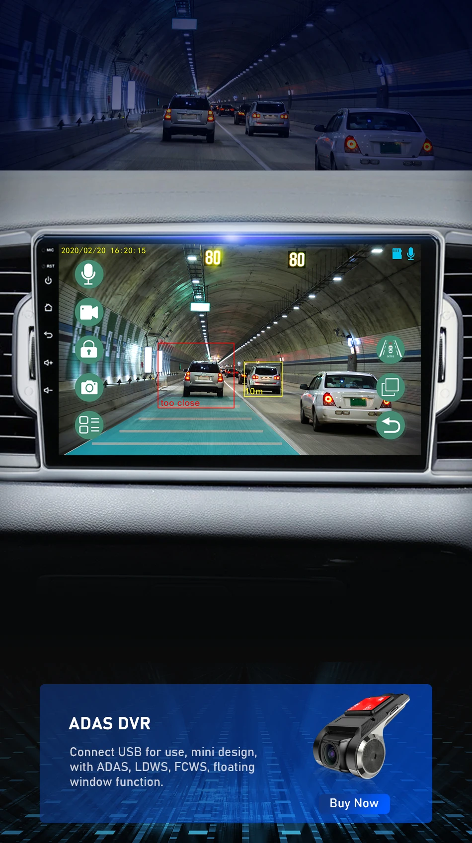 Поддерживает подключение к видеорегистраторУ ADAS. ADAS DVR имеет несколько встроенных ассистивных технологий вождения, вставляя высококачественную карту памяти TF для записи каждого момента вашего вождения.
