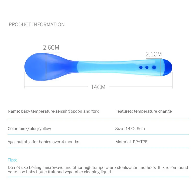 1. Край головки ложки изготовлен из мягкого и эластичного пластикового эластомера, который безопасен в использовании.2. Эластомер на головке ложки содержит термохромные материалы. Когда температура пищи превышает 40 °C, эластомер автоматически побелеет, указывая на то, что пища слишком горячая и не подходит для кормления. Безопасен и удобен в использовании.3. Используемые материалы нетоксичны, безвкусны и выдерживают температуру до 100 °C.4. Пожалуйста, очистите его до и после использования и опустите в воду и прокипятите для дезинфекции в течение 1-2 минут. Если вы обнаружили трещины во время использования, замените его на новый. Рекомендуется мыть сразу после каждого использования, чтобы избежать появления пятен на кончике ложки.