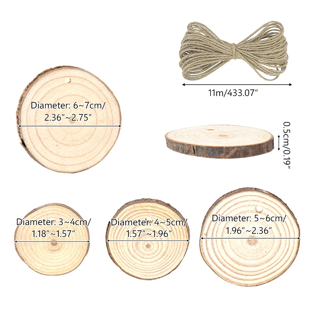 В комплект входит натуральный шпагат. Каждый кусок дерева предварительно просверлен с небольшим отверстием и рулоном джутовой веревки 36 футов для изготовления украшений, подвесного декора или гирлянды.