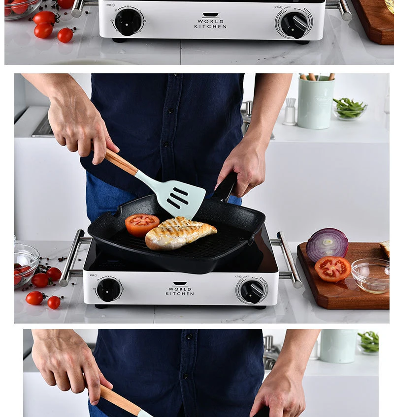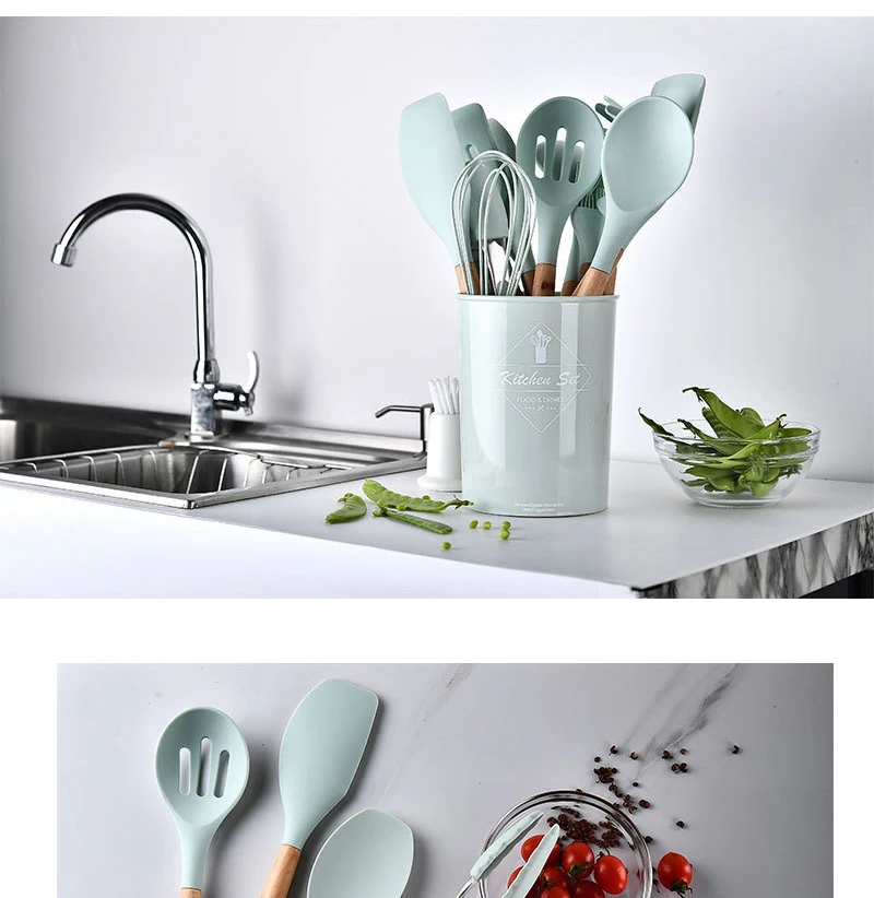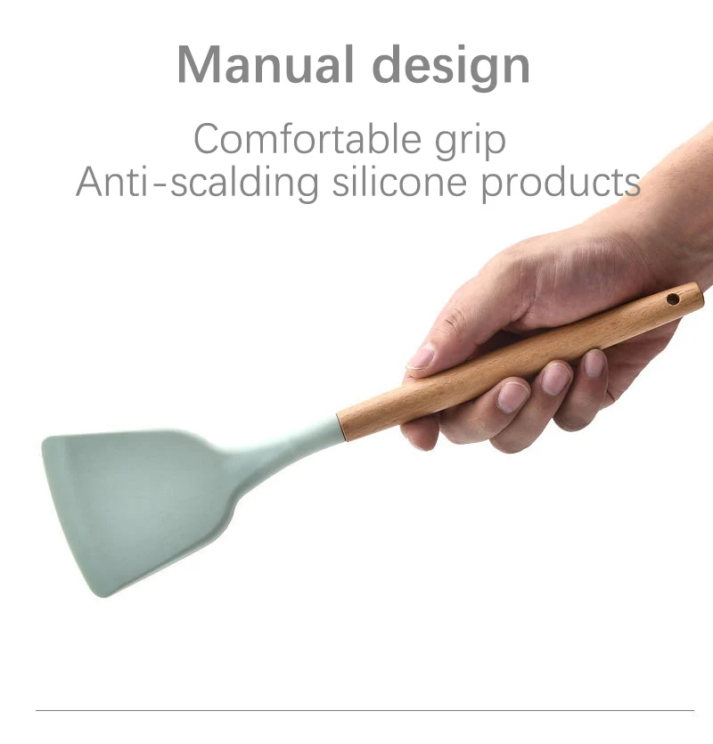 1 шт., силиконовая посуда с деревянными зелеными кухонные приборы, инструмент, многофункциональная ручка, антипригарный шпатель, ковш, яйцо, Beaters