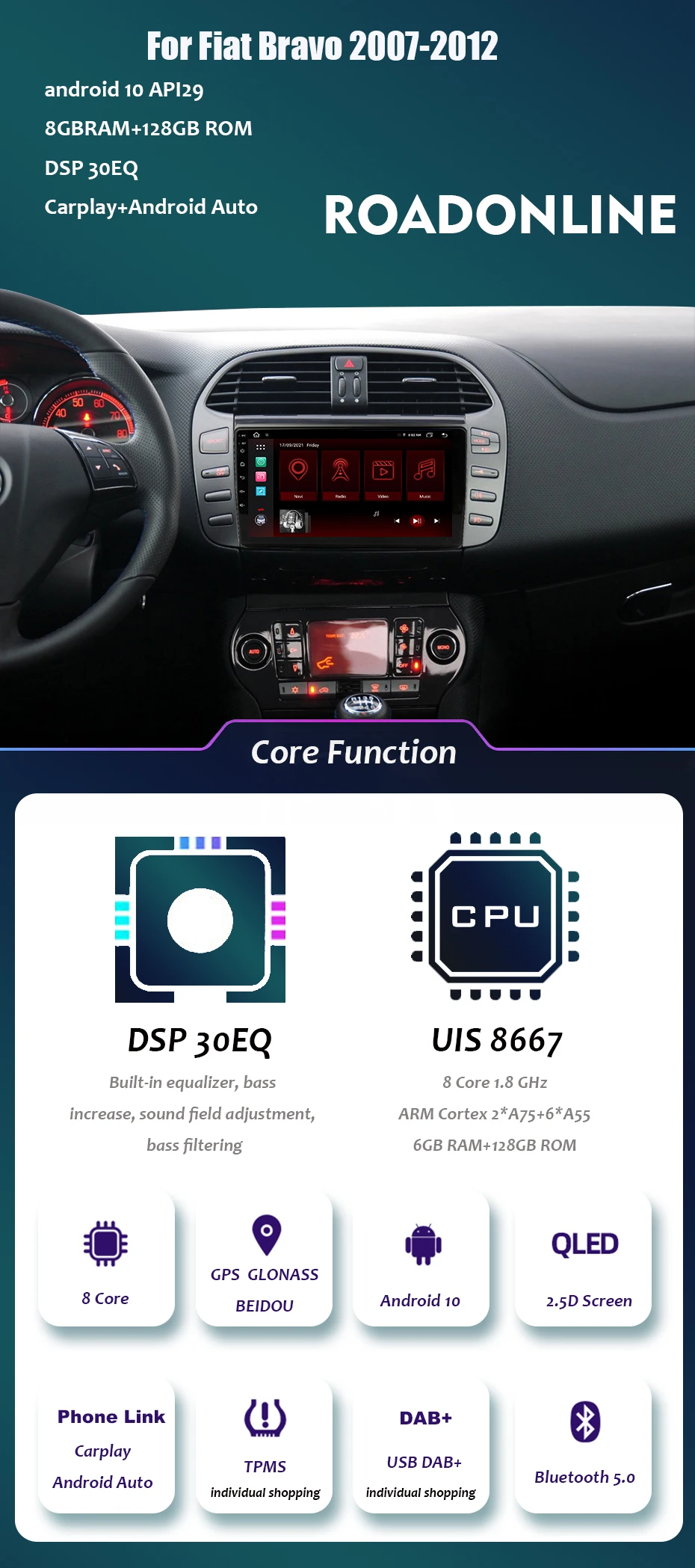 Автомагнитола для Fiat Bravo, мультимедийный плеер на Android 10, 8 + 256 ГБ, для Fiat Bravo 2007, 2009, 2010, 2011, 2012, навигация, стерео, DSP, Wi-Fi, SWC