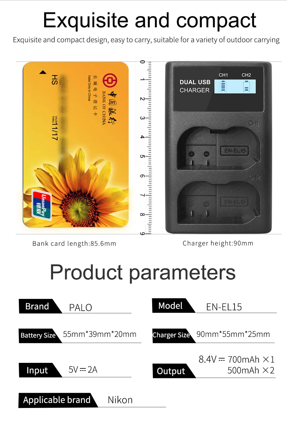 Двойное зарядное устройство PALO EN EL15, ENEL15, для Nikon D500,D6...