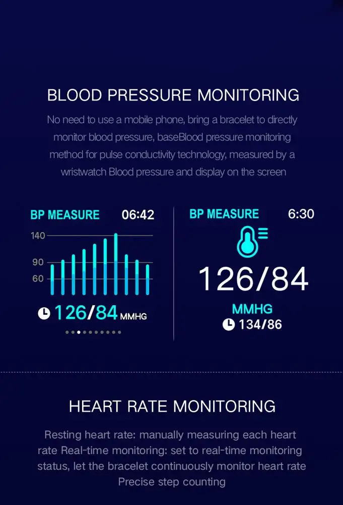 Функция проверки здоровья: пульс, тест на артериальное давление, анализ кислорода в крови (можно сохранить последние 7 записей), отображение времени сна, регулировка яркости экрана, управление музыкой, Вибрационный переключатель двигателя, хранение сообщений истории (3)