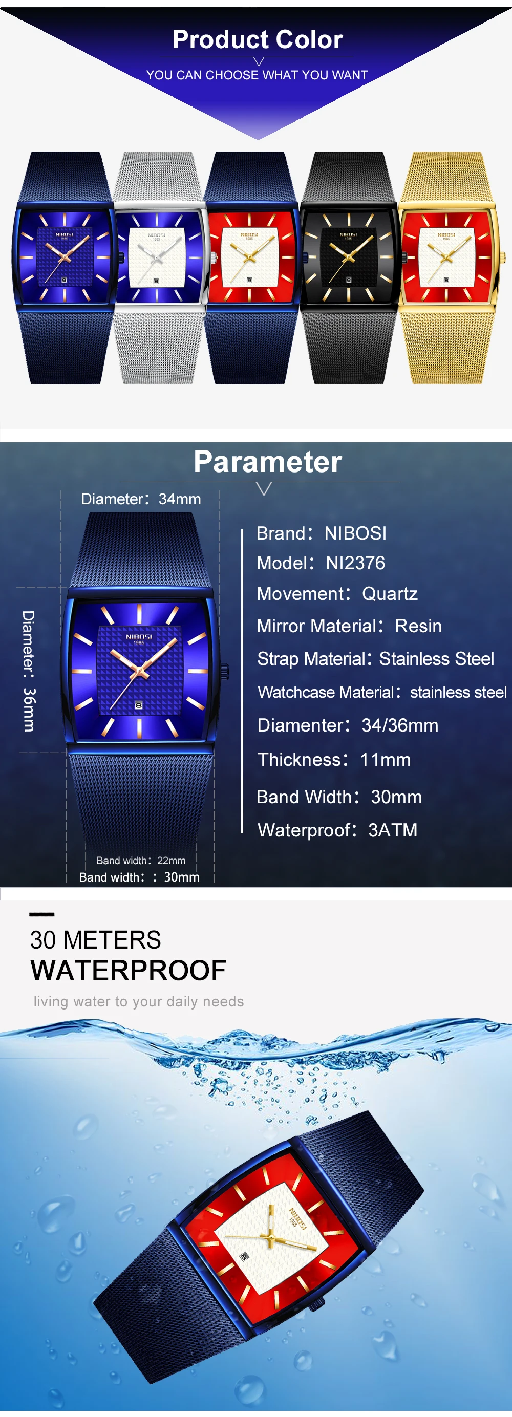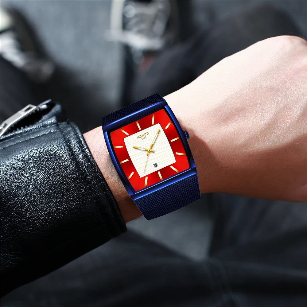 Часы NIBOSI мужские, квадратные, синие, красные, деловые, водонепро...