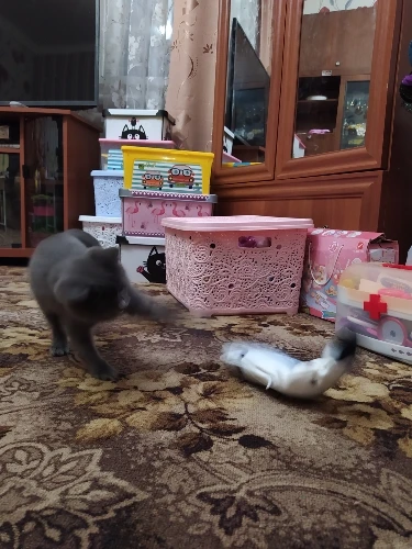 Товар дошел за 3 недели. Все работает, все норм. Как будет играться кошка, понятное дело, зависит от характера конкретного животного. Наша осторожная - однозначно заинтересовалась, но пока изучает, что это за зверь такой