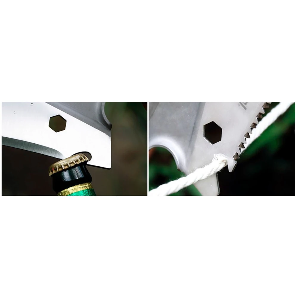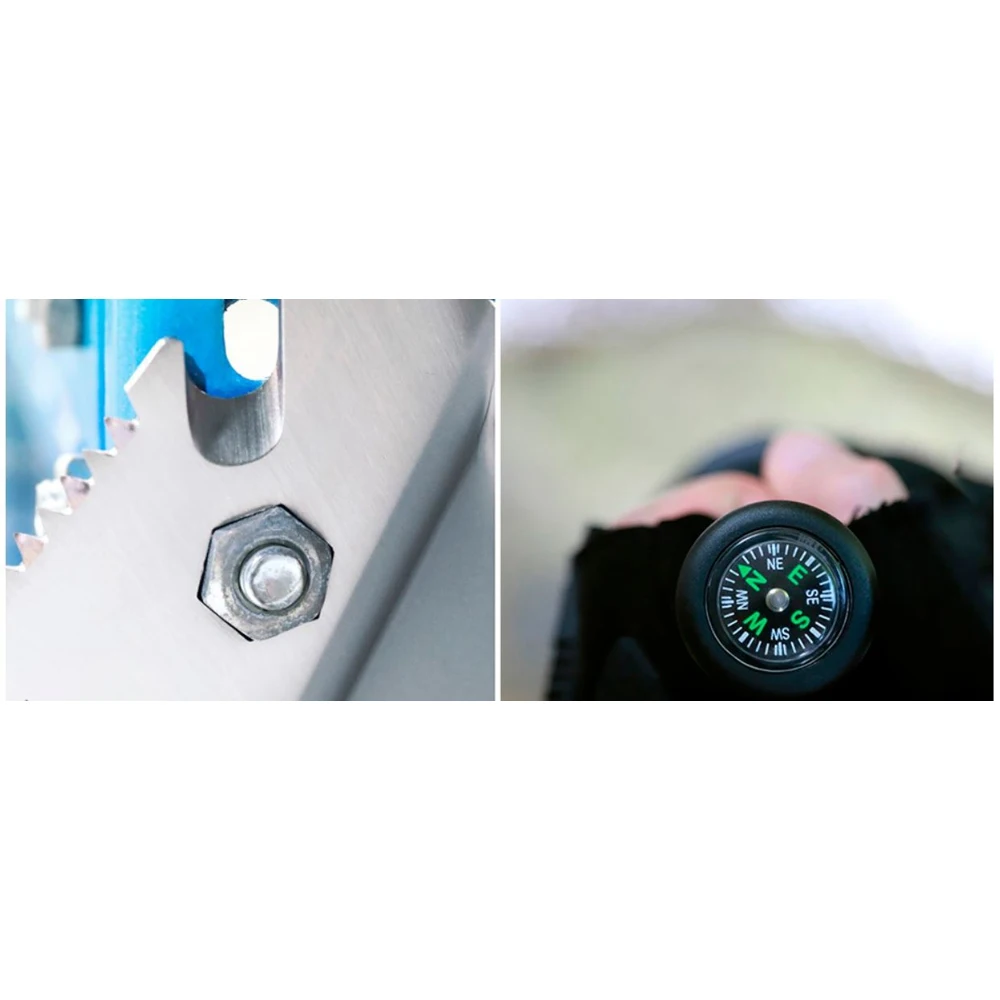 14 функций: 1. Компас. 2. Стеклобой. 3. Свисток. 4. Кресало. 5. Отвертка (плоская+крестовая). 6. Канатный нож. 7. Открывалка. 8. Шестигранник. 9. Пила. 10. 3 составные ручки. 11. Лопата.