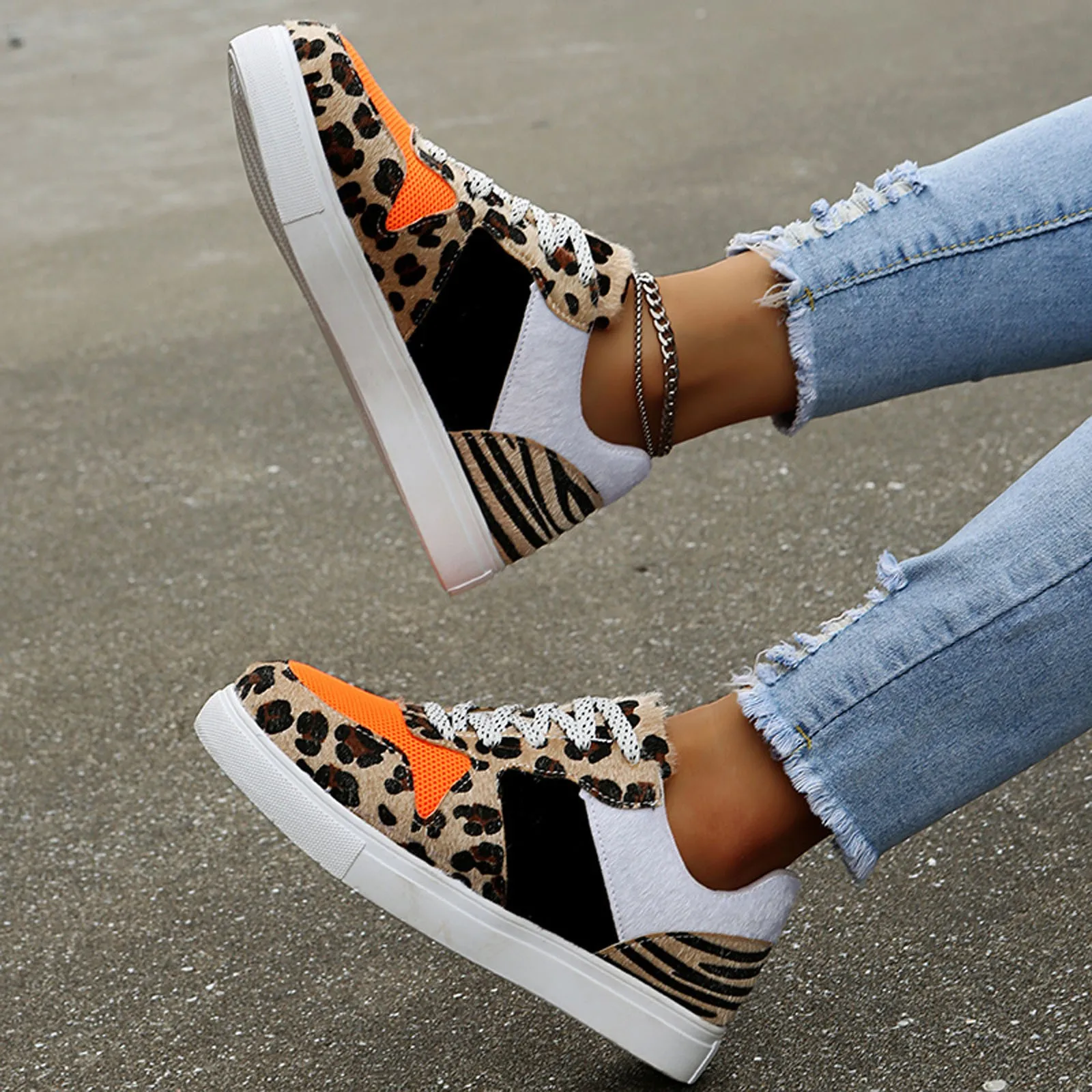 Женские спортивные кроссовки, Повседневная Мягкая дышащая обувь на плоской подошве, с леопардовым принтом, со шнуровкой, разноцветные осенние