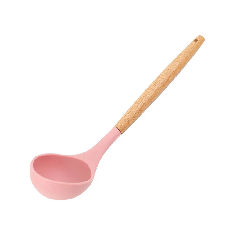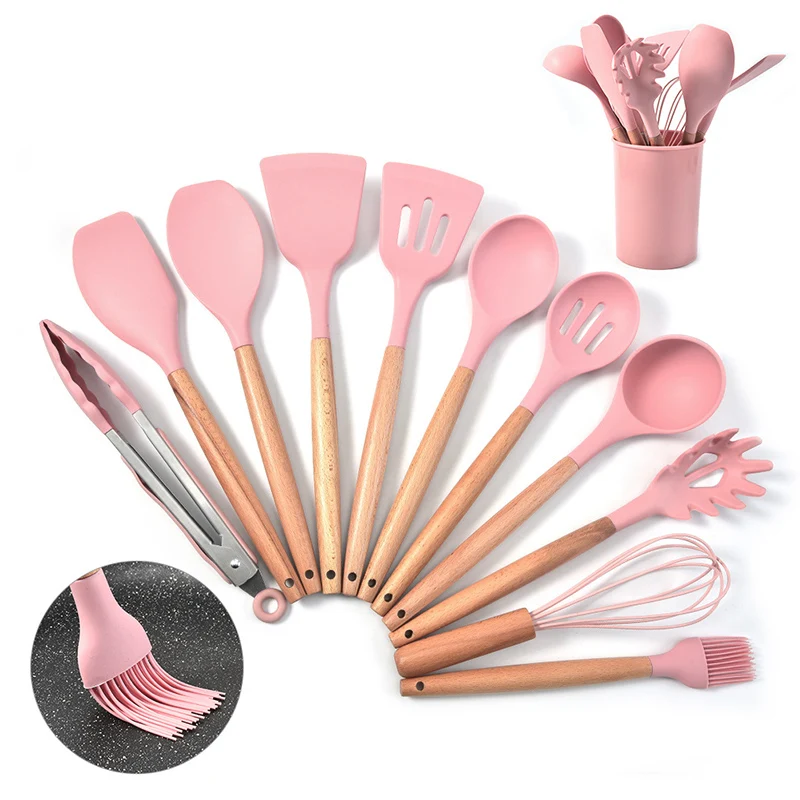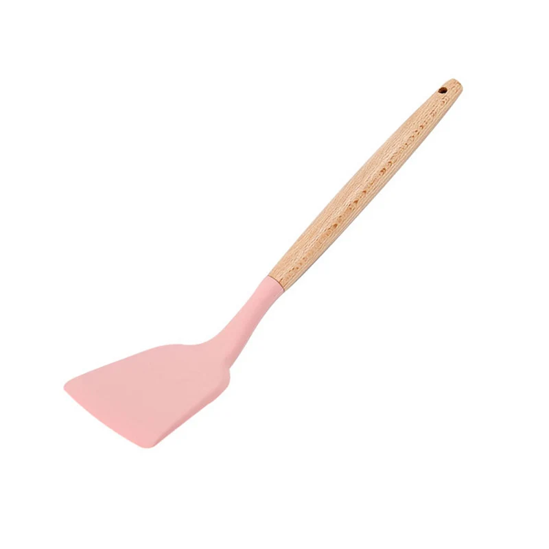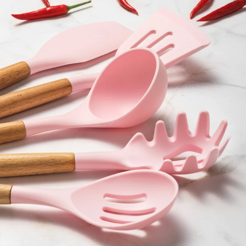 Силиконовая посуда с деревянной многофункциональной ручкой, Розовый инструмент кухонные приборы, антипригарная лопатка, половник, кухонные аксессуары