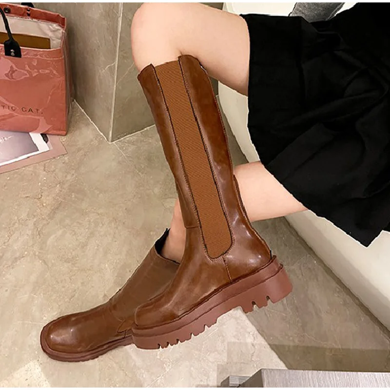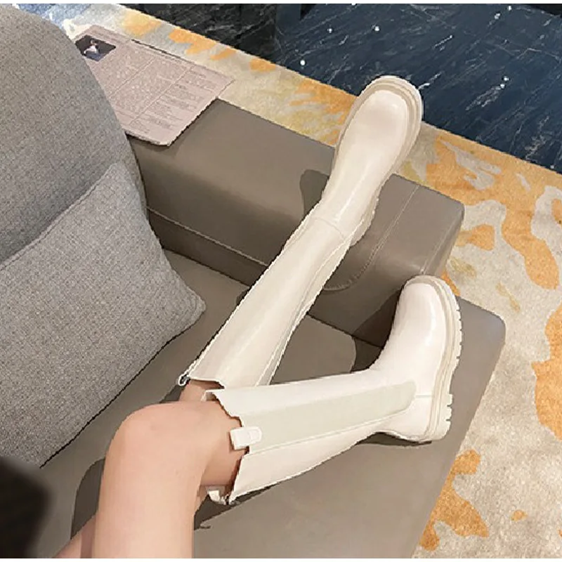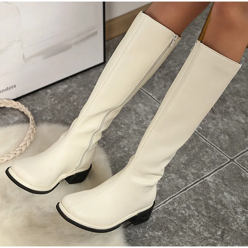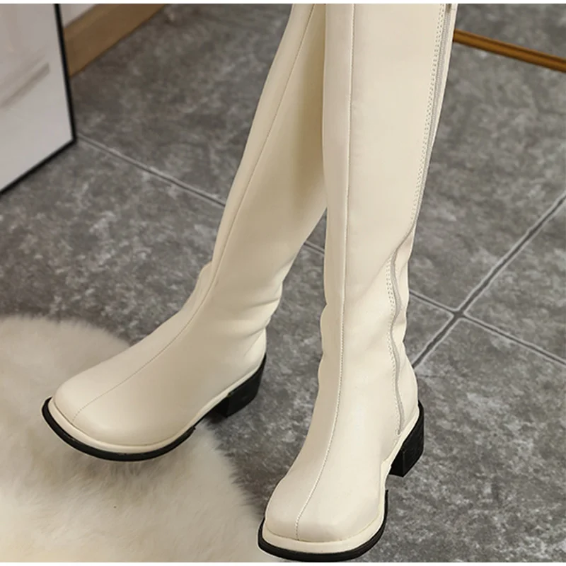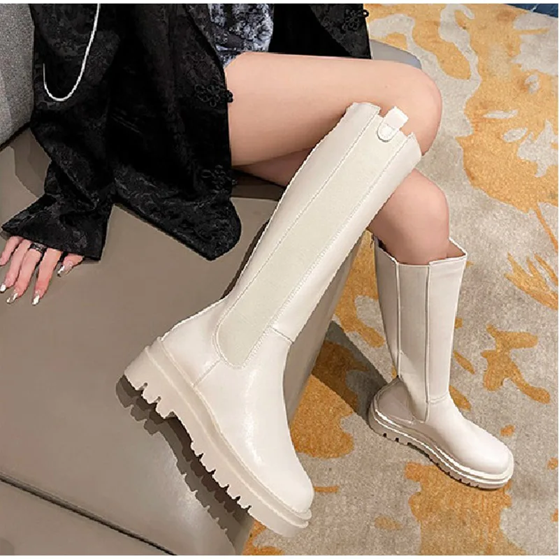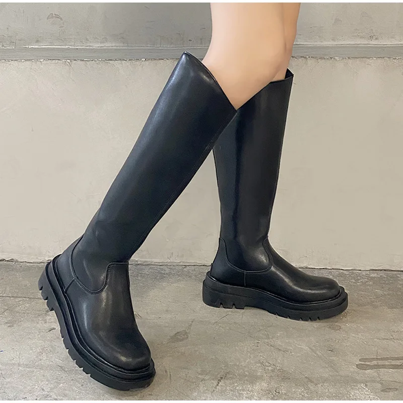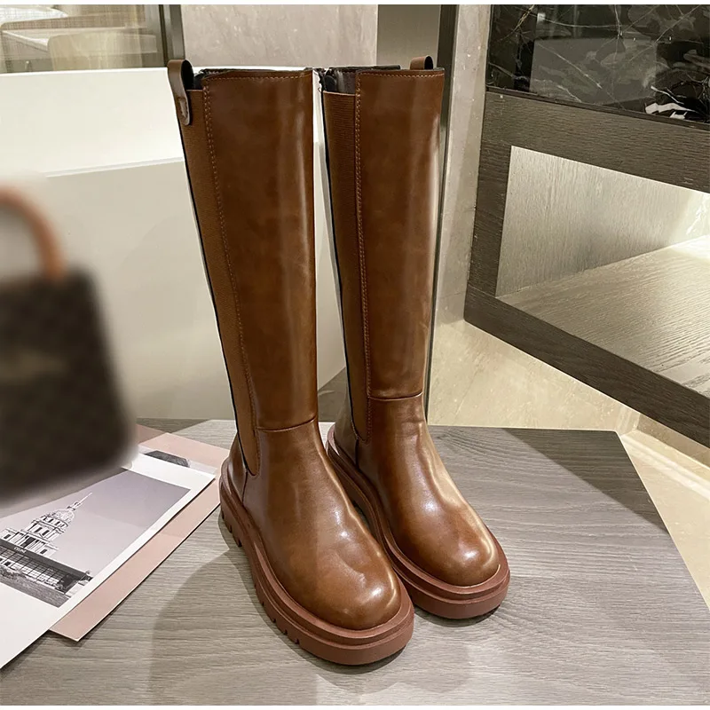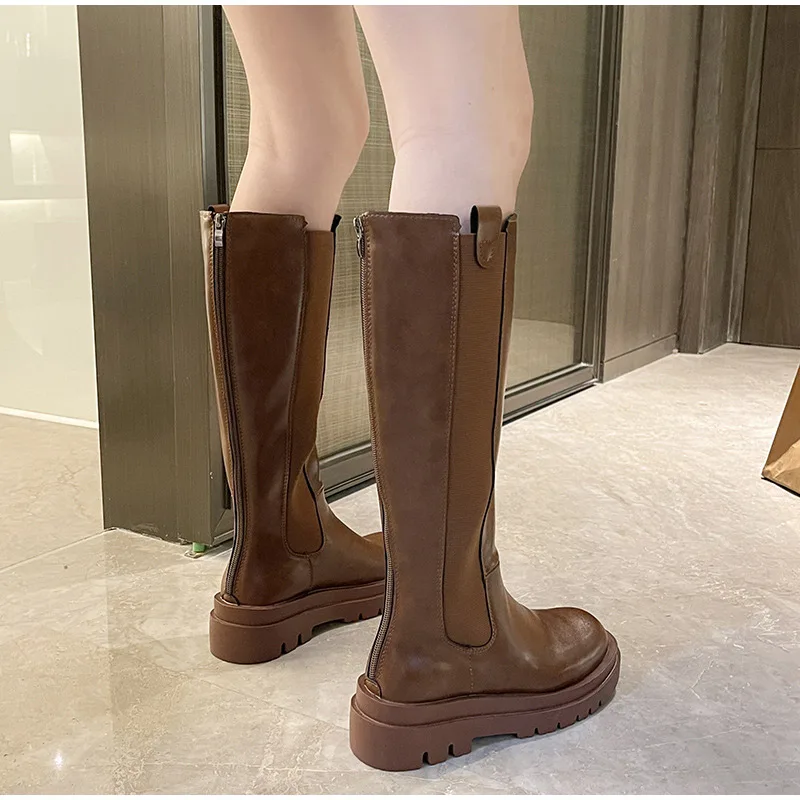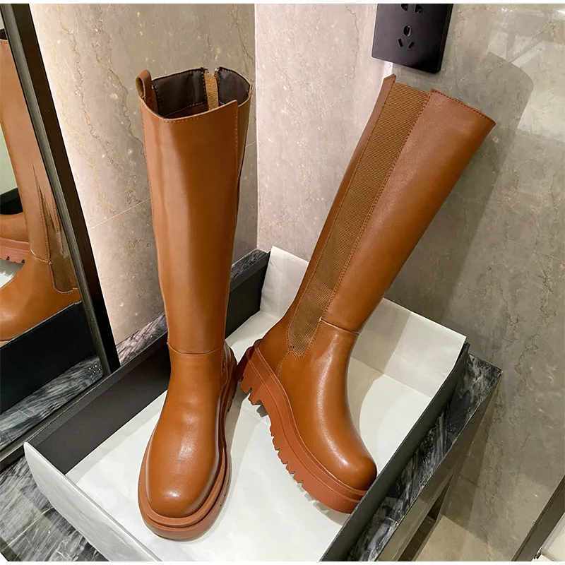 Женские сапоги до колена из мягкой искусственной кожи, высокие сапоги без застежек, женская обувь на толстой платформе с круглым носком, Осень-зима 2022