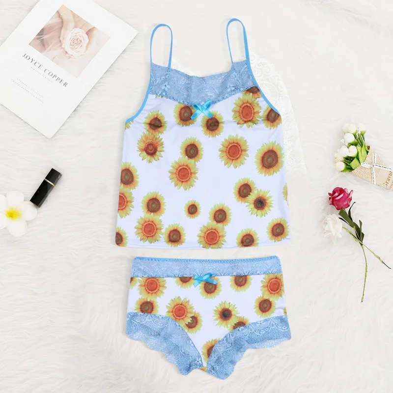7Sleeveless Strap Lace Trim Bowknot Pyjamas Sleep Shorts Set