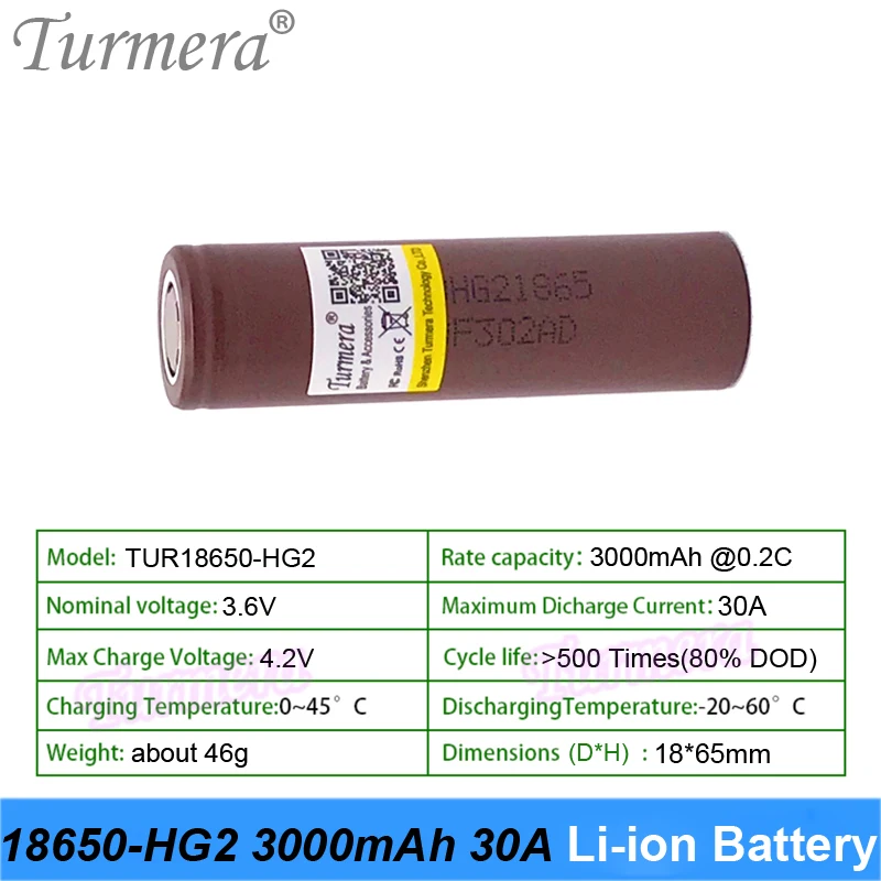 Аккумулятор Turmera 2021 18650 HG2 3000 мАч 30 А для мода электронной сигареты или 12 В 14,4 в 18 в 21 в 25 в Аккумуляторы для электродрели шуруповерта