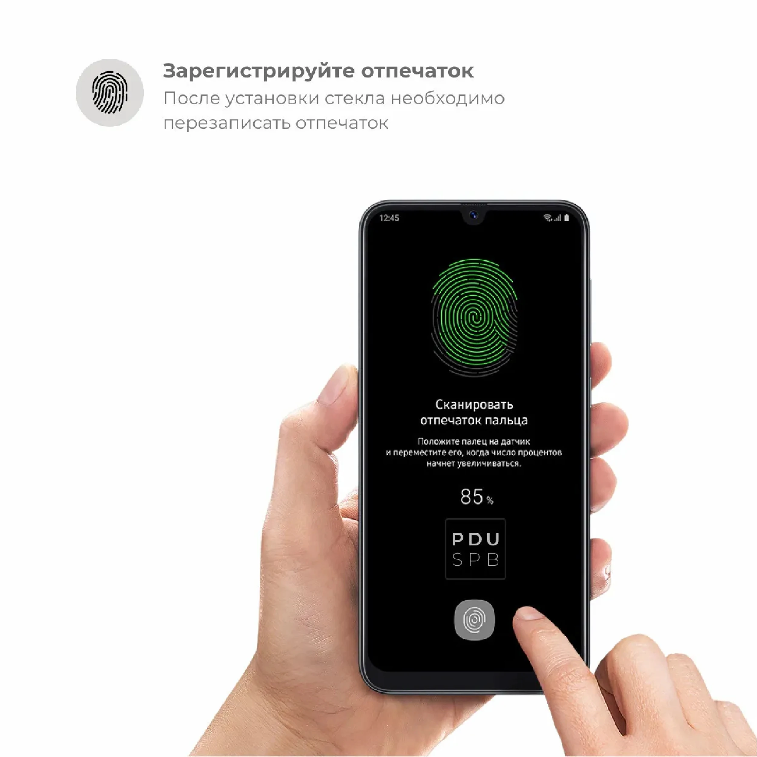 4. Наклейте защитное стекло на дисплей устройства клеевой стороной, выровняв его по краям и технологическим отверстиям.