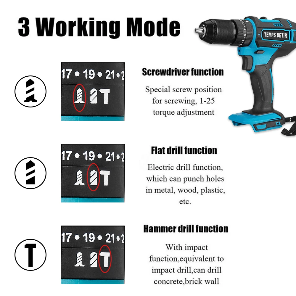 Наименование: электрическая дрельЦвет: синий + черныйМаксимальный крутящий момент: 80-120 НмБез скорости нагрузки: 0-1350 об/минРазмер патрона: 13 ммРегулировка скорости: 2 скоростиКрутящий момент: 1-25Батарея: подходит для Makita 18V/21V БатареяРазмер: 20x19, 5 см/7,87x7,67"Применение затягивает и ослабляет винты, просверливает отверстия и т. Д.