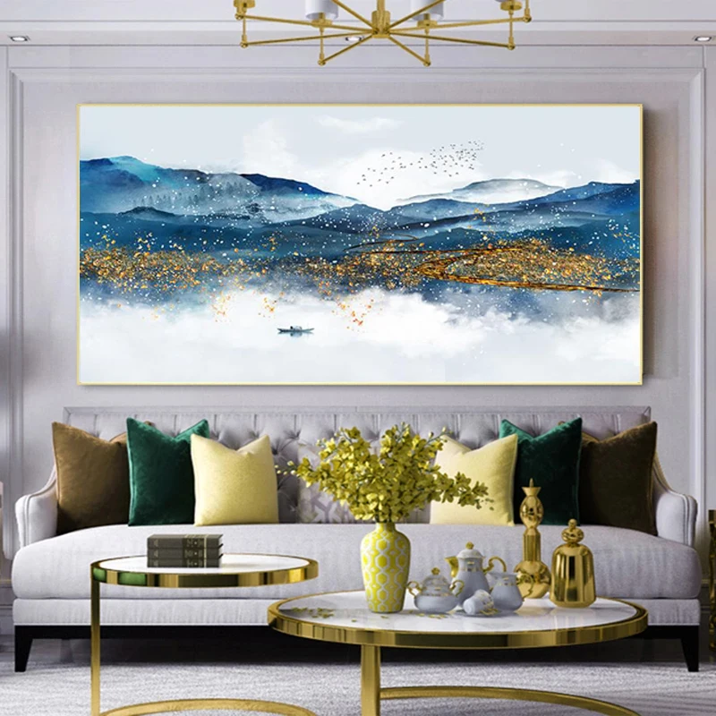 Настенные художественные плакаты с изображением синего золотого горного пейзажа, Настенная картина для гостиной, домашний декор