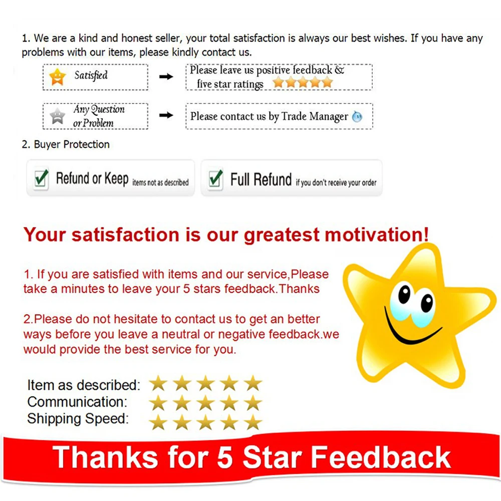 Уважаемый покупатель, если у вас есть какие-либо вопросы, пожалуйста, свяжитесь с нами. И мы ответим в течение 24 часов, кроме выходных. Если вы не удовлетворены нашим продуктом и обслуживанием, пожалуйста, свяжитесь с нами, прежде чем оставить отрицательный отзывы, тогда мы постараемся сделать все возможное, чтобы решить проблемы и сделать вас удовлетворенными.