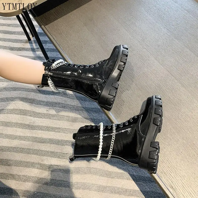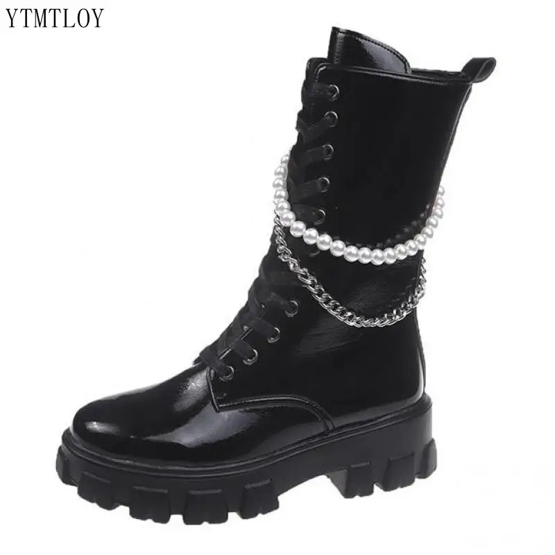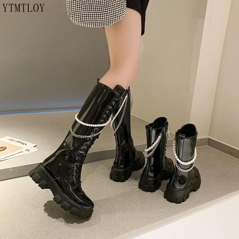 Женские мотоциклетные сапоги на массивной платформе, кожаные сапоги до колена с бусинами и металлической цепочкой, зимняя обувь