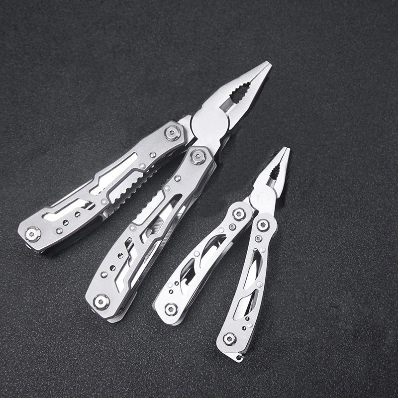 14 в одной функции: 1. Плоскогубцы (игольчатые плоскогубцы, плоскогубцы для круглых труб, кусачки) 2. Нож 3. Крестовая отвертка 4. Маленькая шлицевая отвертка 5. Нож для рыбьей чешуи 6. Съемник 7. Двусторонний напильник 8. Большая шлицевая отвертка 9. Скребок 10. Средняя шлицевая отвертка 11. Консервный нож 12. Открывалка для бутылок